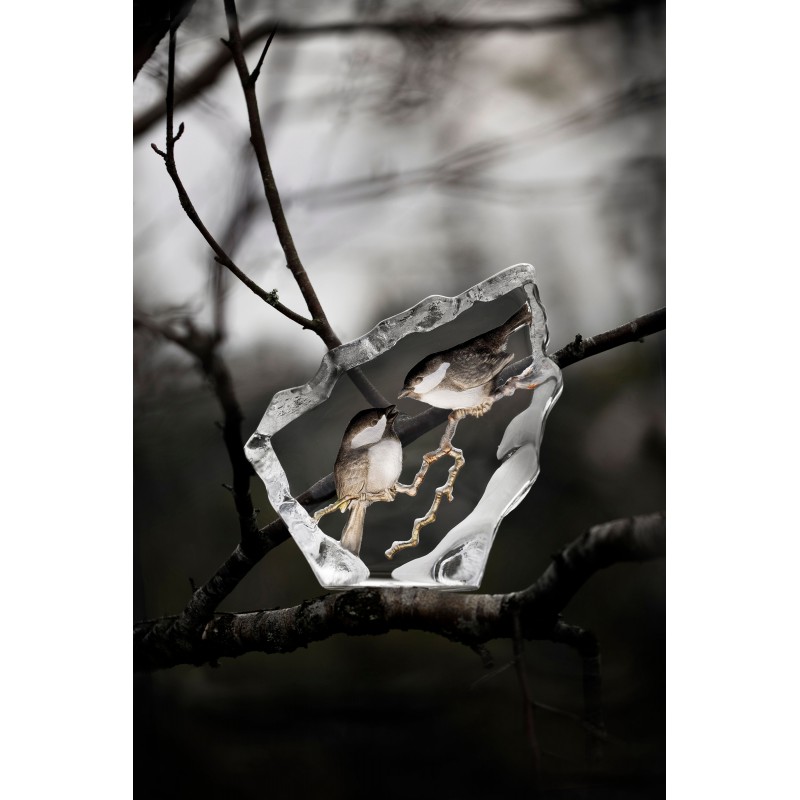 Dit helder kristal glazen MALERAS WILDLIFE BIRDS sculptuur van een paartje Mussen is ontworpen door Mats Jonasson.