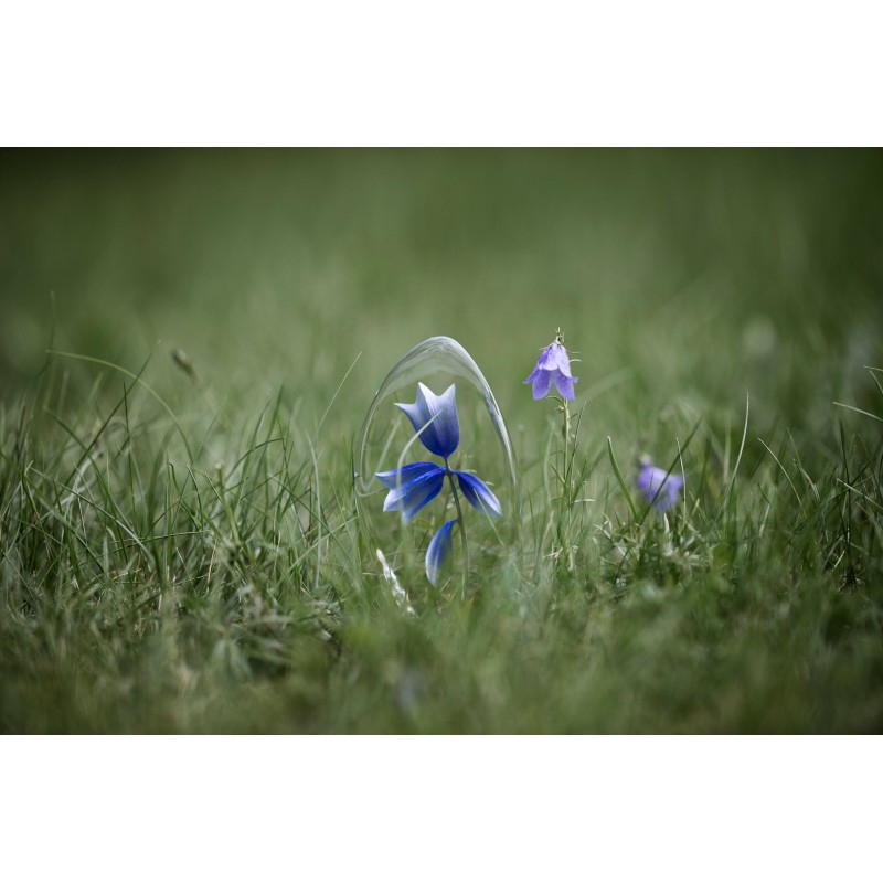 Deze helder kristal glazen MALERAS sculptuur FLORAL FANTASY met blauw Grasklokje is ontworpen door Mats Jonasson .