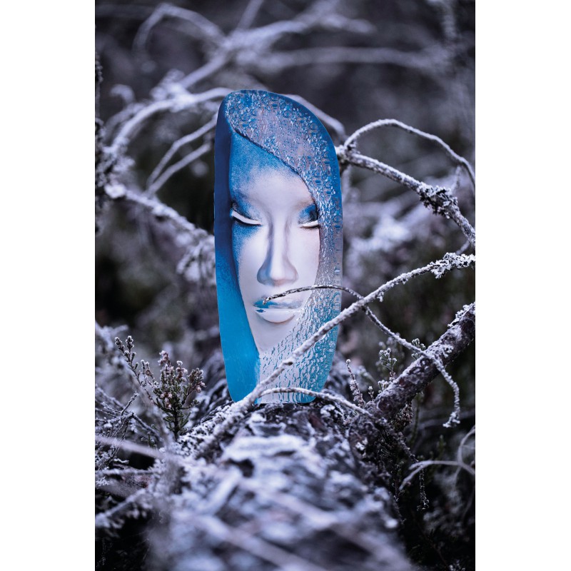 Deze helder kristal glazen MALERAS sculptuur MASQ Mystiqua blauw is ontworpen door Mats Jonasson .