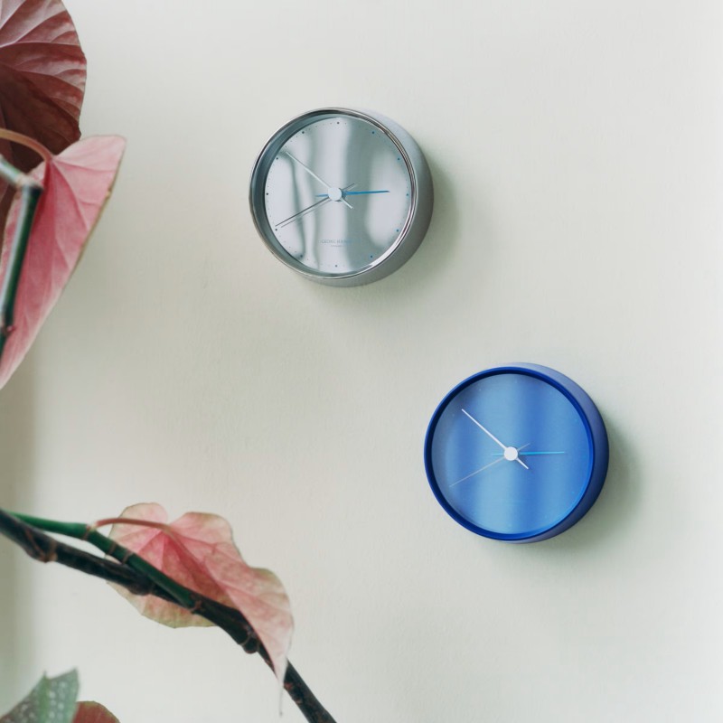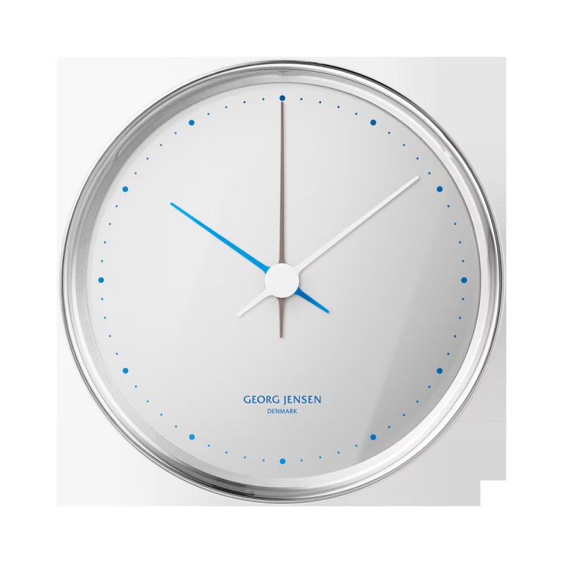 Deze RVS GEORG JENSEN klok Henning Koppel met witte wijzerplaat is mooi door zijn eenvoud. Stijlvol accent door de verschillend gekleurde wijzers.
