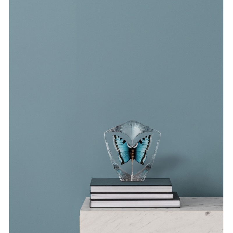 Deze kristal helderglazen MALERAS WILDLIFE sculptuur met blauwe vlinder is ontworpen door Mats Jonasson. Handmade in Zweden.