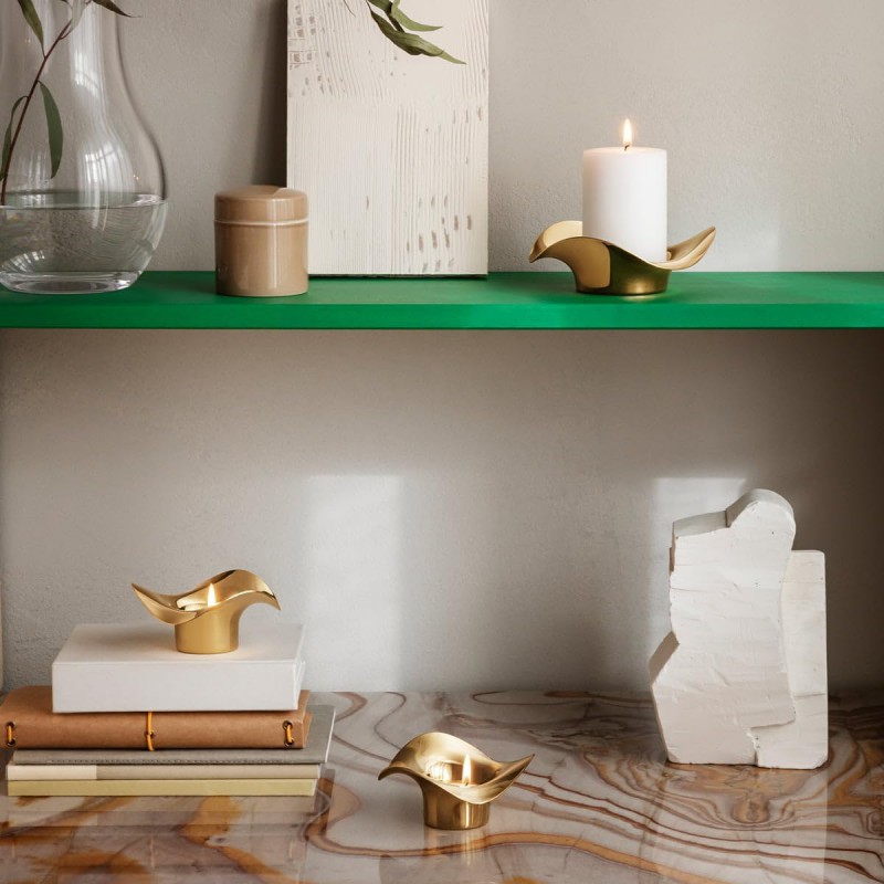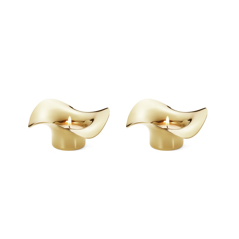 Deze set van 2 goudkleurige Georg Jensen waxinelichten COBRA staat mooi op iedere tafel of dressoir. Duidelijk herkenbaar is de typische Cobra vormgeving. Stijlvol en elegant. Ontwerp van Constantin Wortmann.