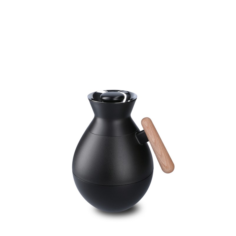 Deze zwarte ROSENDAHL thermoskan STAY WARM is ontworpen in 2026 door JASPER VOLLMER. Een mooi Scandinavisch accent door het met wax bewerkte houten handvat.